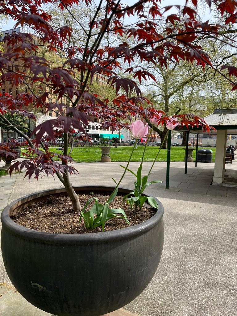 Berkeley Square Gardens bowl featuring red maple and pink tulips