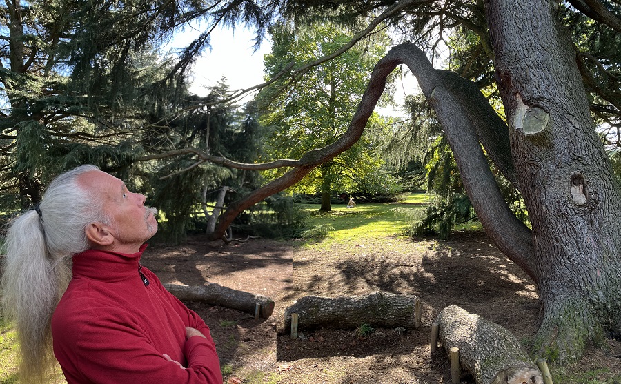 Simon telling us how a storm blew over a cedar which knocked this one sideways pulling roots out of the soil, but it landed on its elbow and survived