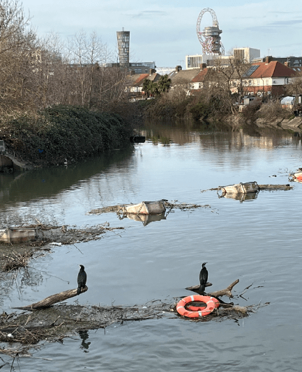 Cormorants on River Lea looking north near Three Mills Lock, with Olympic Torch tower and ArcelorMittal Orbit by Sir Anish Kapoor beyond