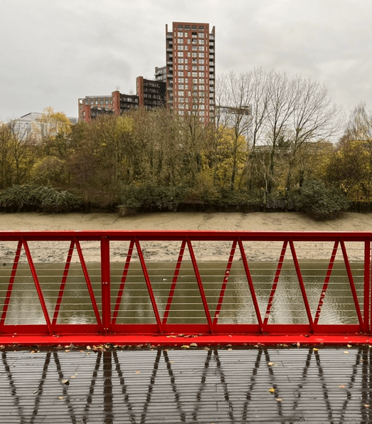 Bow Creek and the Ecology Park seen from Hope Street on Leamouth Peninsula with Avalon Point building behind. Dec 2023