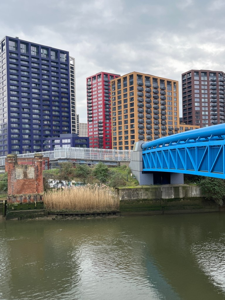 Reed bank on the River Lea at Bow Creek, behind and above – City Island built by Ballymore. We’ll see their work again when we reach Nine Elms.